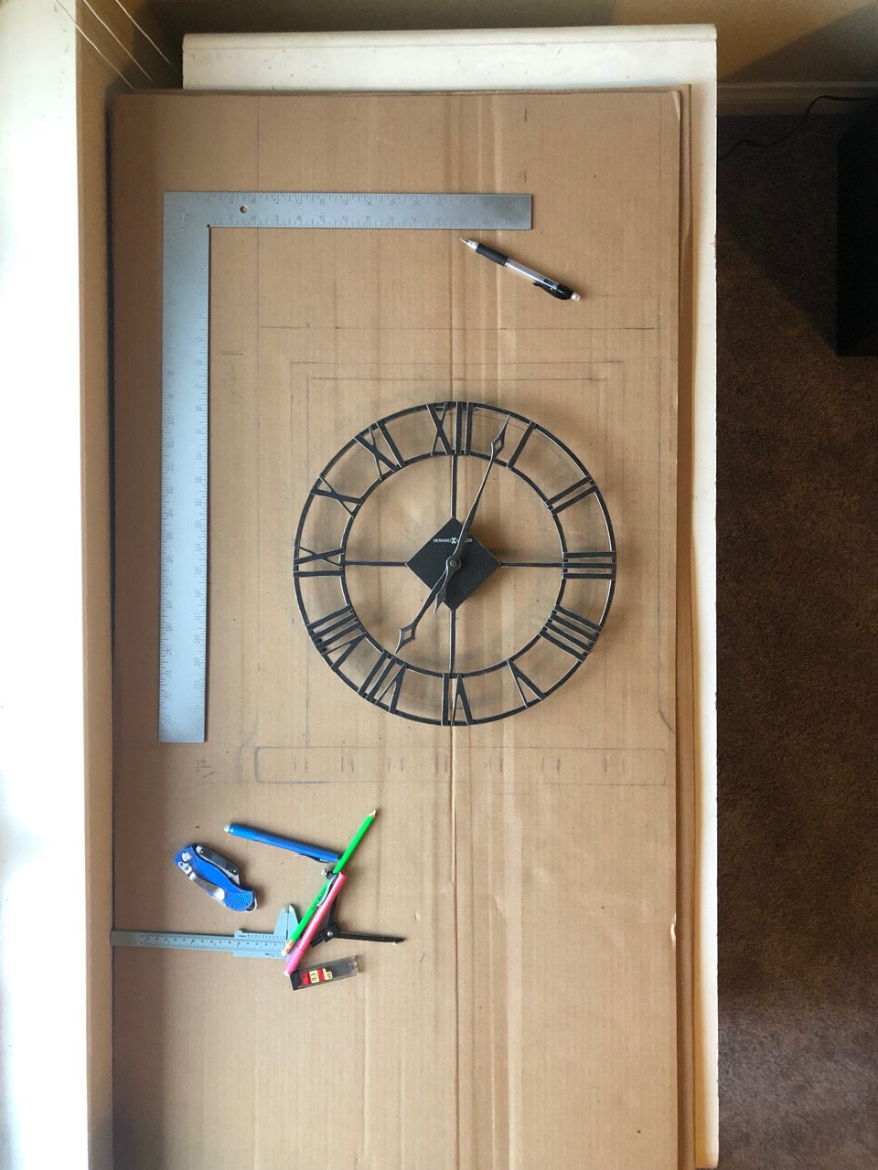 So with cardboard and measurements at hand, I set out to pre-build the most important and detailed part of the project, the face. I started by drawing out a square from the outer borders of the face and the lower decorative bar. I had a 14” wall clock laying around that I was able to use to check the scale, and I was really liking the look of it (though it was a bit big compared to what I wanted, which is good.)