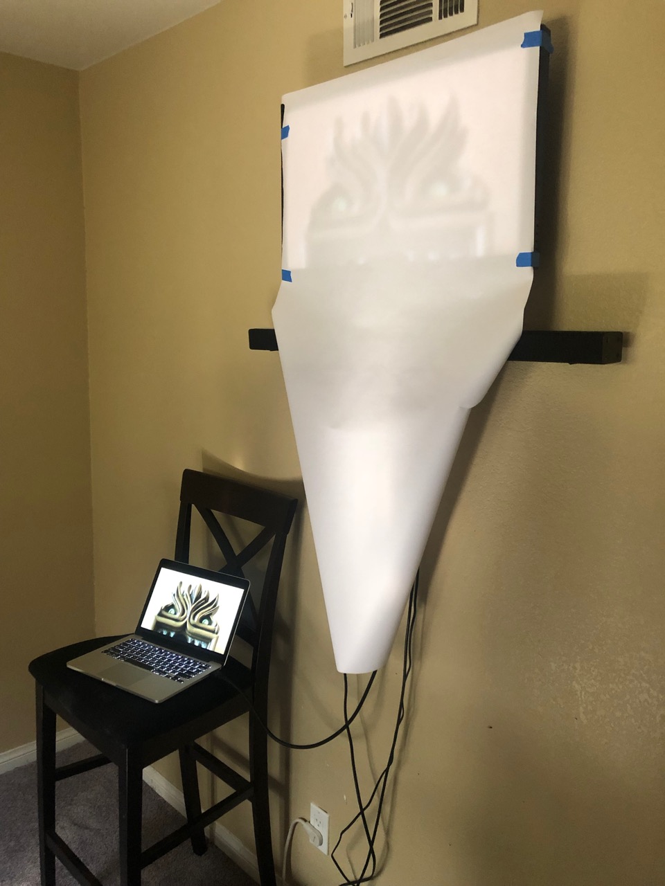 After building the main structure of the face, it was time to add the details. Not having a projector at hand I grabbed a cheap roll of white paper and draped it over a TV to trace. This actually worked really well as I was able to load the image of the clock on my laptop through HDMI and zoom in until it was full size. So I zoom in until the distance between the borders was what it should be (13″, and the border measurements lined up perfectly, so that was reassuring!) With that I was able to trace the face details in pretty easily, then later transfer those to the cardboard. Two things that would have made this a lot better though — using my bigger (and much brighter) TV in the other room, but there was too much junk around it that I didn’t feel like moving, or option #2 just breaking down and buying a projector from Michael’s and drawing this directly and perfectly onto the cardboard (I may still do this to draw it onto the wood).
