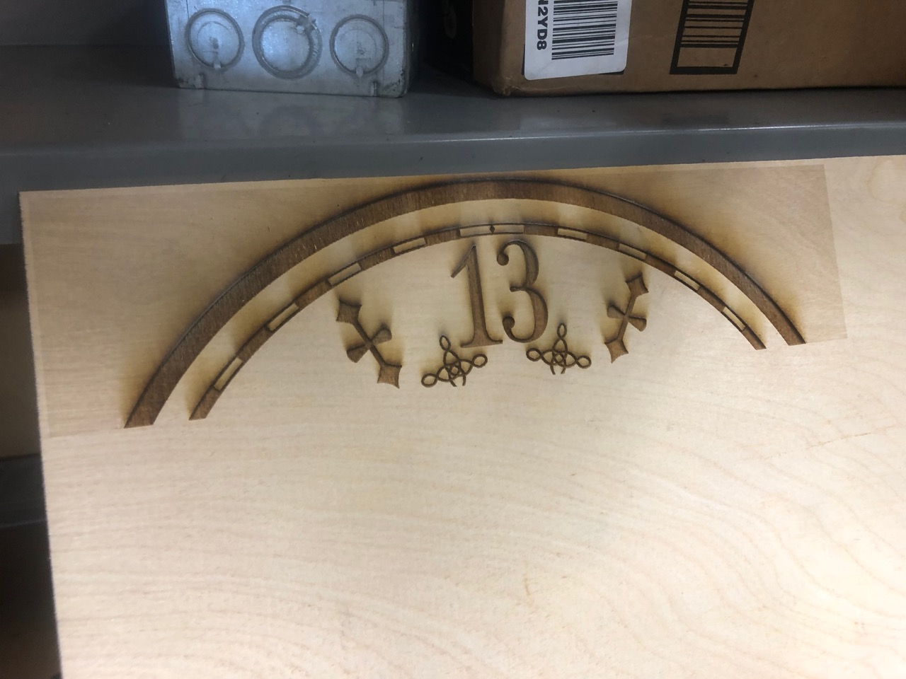 Now this part was a lot of fun for me. I went through a lot of different ideas and a few impossible wants, and it took a while to get to where I ended up. The end result was well worth it. I’m really happy with how this stage took shape. What I REALLY wanted for this thing was a glow in the dark green dial like the toy has. I wasn’t sure which materials were available to make this happen, or what I should even be asking people for. I was hoping for a glow in the dark green plastic or something of that nature… But to get the design on it… Hand paint it? print it? Stickers? I’m not even sure. Idea 1: I’d seen an image floating around which would be perfect. A high res jpeg of the clock dial laid out perfectly for printing (from our very own lostcasket, unbeknownst to me at the time!) A friend of mine printed it out BEAUTIFULLY on vinyl for me. I wasn’t sure if I was going to just adhere that to clear vinyl and backlight it? Leave enough of a gap in front of the dial to front-light it with LEDs, or take a LOT of time to hand cut out the detailing with an x-acto and just stick the details on some green plastic that I could backlight? I’m not sure. Idea 2: So I’d picked up my stickers, and while I was contemplating my possible methods of using these things I started driving door to door to every plastics/sign shop in Vegas. A couple had some green acrylic, but it wasn’t the green I wanted, usually it was clear green, one place had frosted but it was a lot greener than I’d wanted, and only sold by the sheet, WAY more than I needed and not ‘perfect’ anyway. I’d found a couple places online that had actual glow in the dark acrylic but the sticker on the webpage was way too much. Anyway, at this point I was so confused by which places I’d been to and which I hadn’t I just started calling websites that had the glow in the dark, maybe one would sell me a 12×12, even if it’s expensive it’d cost less than a sheet, and I only need one. Turns out one shop was in Santa Ana, CA, Paragon Plastics (not far from my parents’ house, link toward the bottom) and they had ACTUAL glow in the dark acrylic for 50 bucks for a 12×24” piece. Perfect! More expensive than any other color, but I’m only going to need half of this so now I’ve got two tries with the material and it’s exactly what I was looking for. I’m totally OK with this. My girlfriend just happened to be in the area that day and offered to pick it up for me, so I tell them over the phone I’ll take one 12×24” and she picks it up for me a half an hour later! Now back to the problem of… what to do with this thing? I was still considering cutting the details out of lostcasket’s sticker, it’s the best way to get perfect lines as long as I very carefully take my time. Hand painting would be possibly a better (more personal/organic) way to do it, but no way it would look as ‘perfect’, and a stencil would be tough to make… I had gone back and forth with a couple friends who tell me they have access to a laser cutter and to just clean up the image, send it to them, and come cut it. Best. Idea. Yet. I send one of them the image and he cleans it up nicely. Unfortunately what we have is a JPEG which apparently has an effect on the way the engraver works. I mention this only because we now have vector images provided by lostcasket! (linked below!) So now we’ve got the image cleaned up as much as we can and they get to work. First they printed a test image on wood, which looked amazing (I’ll be asking them to reburn me an oak dial once I decide on a stain!) Second, they ran a test on some inexpensive clear acrylic to see what adjustments we would need to make for the plastic vs the wood so we can MAYBE get this right in one shot on the much more expensive glowing plastic. The first attempt on the glow in the dark acrylic was perfect, as good as I could have hoped for. The ONLY thing we had to look at was some ghosting outlines from the laser since we didn’t tape the plastic. Being that it was frosted plastic anyway, you couldn’t even tell. We did do a second attempt without removing the protective plastic so that we could protect the acrylic with the plastic covering it. Bad idea, it cut the image into the plastic, but melted the plastic covering the plastic, into the plastic. That didn’t work too well, and now I had to hand-pick dozens of tiny pieces of well stuck flat protective plastic from the design on the acrylic. I think it will be just as useable as the first one, but the first one is more perfect, so that’s the one we’re going to use. (lostcasket has since provided me with a link of 3 vector images to download (and distribute!) so we will eventually be re-doing this for one more dial with all of our lessons learned.) When we do another, we’ll be removing the protective plastic, covering it with painters tape, lasering it using the newly acquired vector images, spray painting it, peeling the tape and enjoying a very easy perfect print. But we’ll get into paint in the next post.