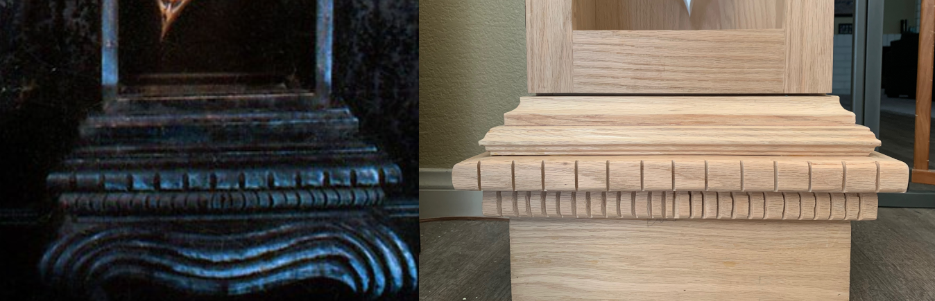 I’ve added a ton of detail to the base of the clock over the past couple weeks… Based off of this image of the original clock off of flickr, a comparison of what I’ve got so far on the base: