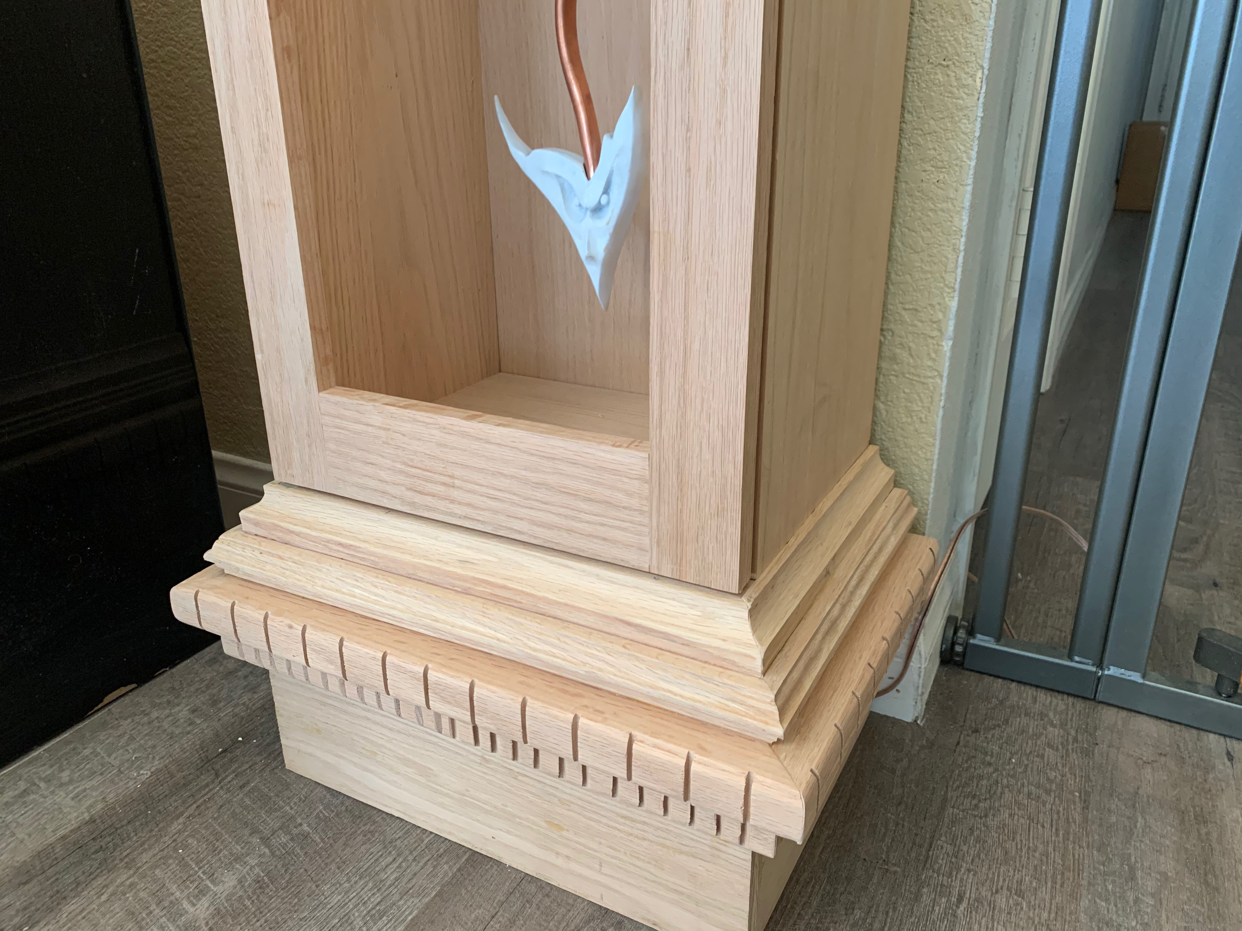 I took the base box and added a sheet of plywood leaving a 3/4” ledge at the top of the box. I inset the first piece of 3/4” moulding that I routed into that and it fit perfectly. Beneath that I had a piece of moulding that I originally intended for the top box, but didn’t use… It wasn’t quite right, but after I flipped it over and routed the other side I was able to give it a jutting-out type lip which matches the original clock enough that I’m totally satisfied with it. The next piece was 2×3/4” pieces on top of one another, I rounded the edge and ran it through the table saw on 1-1/4” intervals (giving me 13 marks!). Beneath that I had to set the saw to a 45º angle and ran it through every 5/8ths facing the outside from the middle, so the left side cuts to the right, right side cuts to the left, 12 on each side and a 13th in the middle shared by both, totally unintentional, there’s one more mark on the top piece, and I think one on each side on the bottom piece, but it made the spacing work out a lot cleaner.. Next up I’m going to have to make a skirt for the bottom with the beast’s legs, that one is going to be tough, but I think I’ve got an idea to make it work. I think while I work on that I’ll order some glass and paint the pendulum. I think we’re going to go with an old aged/weathered brass for the pendulum and the serpent head. It’ll be a first and I really hope I don’t mess that part up. After that is the even more intimidating staining of the clock, looks like we’re getting into no-mistakes-allowed land. | |