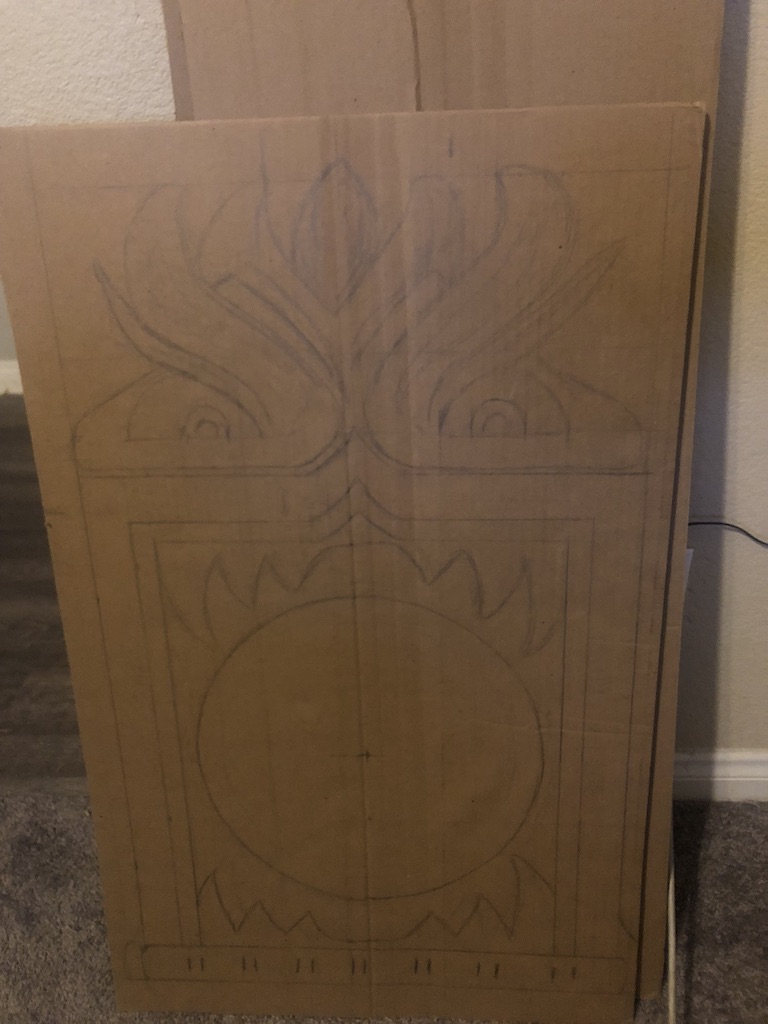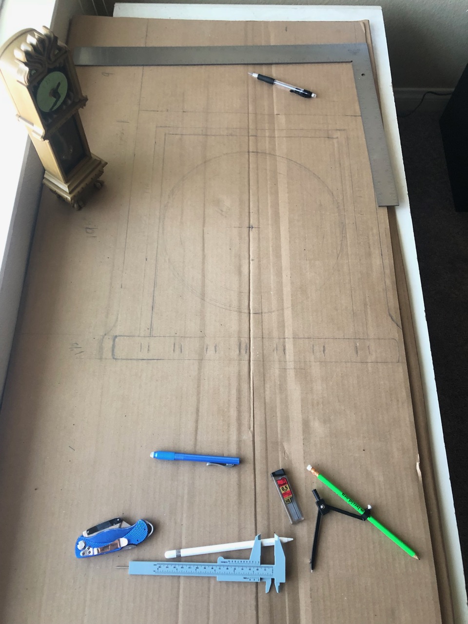 So with cardboard and measurements at hand, I set out to pre-build the most important and detailed part of the project, the face. I started by drawing out a square from the outer borders of the face and the lower decorative bar. I had a 14” wall clock laying around that I was able to use to check the scale, and I was really liking the look of it (though it was a bit big compared to what I wanted, which is good.)