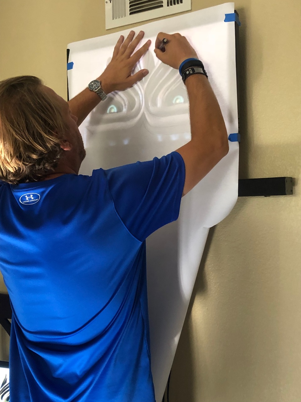 After building the main structure of the face, it was time to add the details. Not having a projector at hand I grabbed a cheap roll of white paper and draped it over a TV to trace. This actually worked really well as I was able to load the image of the clock on my laptop through HDMI and zoom in until it was full size. So I zoom in until the distance between the borders was what it should be (13″, and the border measurements lined up perfectly, so that was reassuring!) With that I was able to trace the face details in pretty easily, then later transfer those to the cardboard. Two things that would have made this a lot better though — using my bigger (and much brighter) TV in the other room, but there was too much junk around it that I didn’t feel like moving, or option #2 just breaking down and buying a projector from Michael’s and drawing this directly and perfectly onto the cardboard (I may still do this to draw it onto the wood).