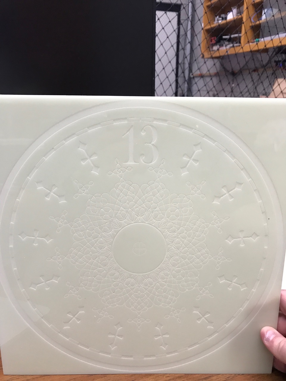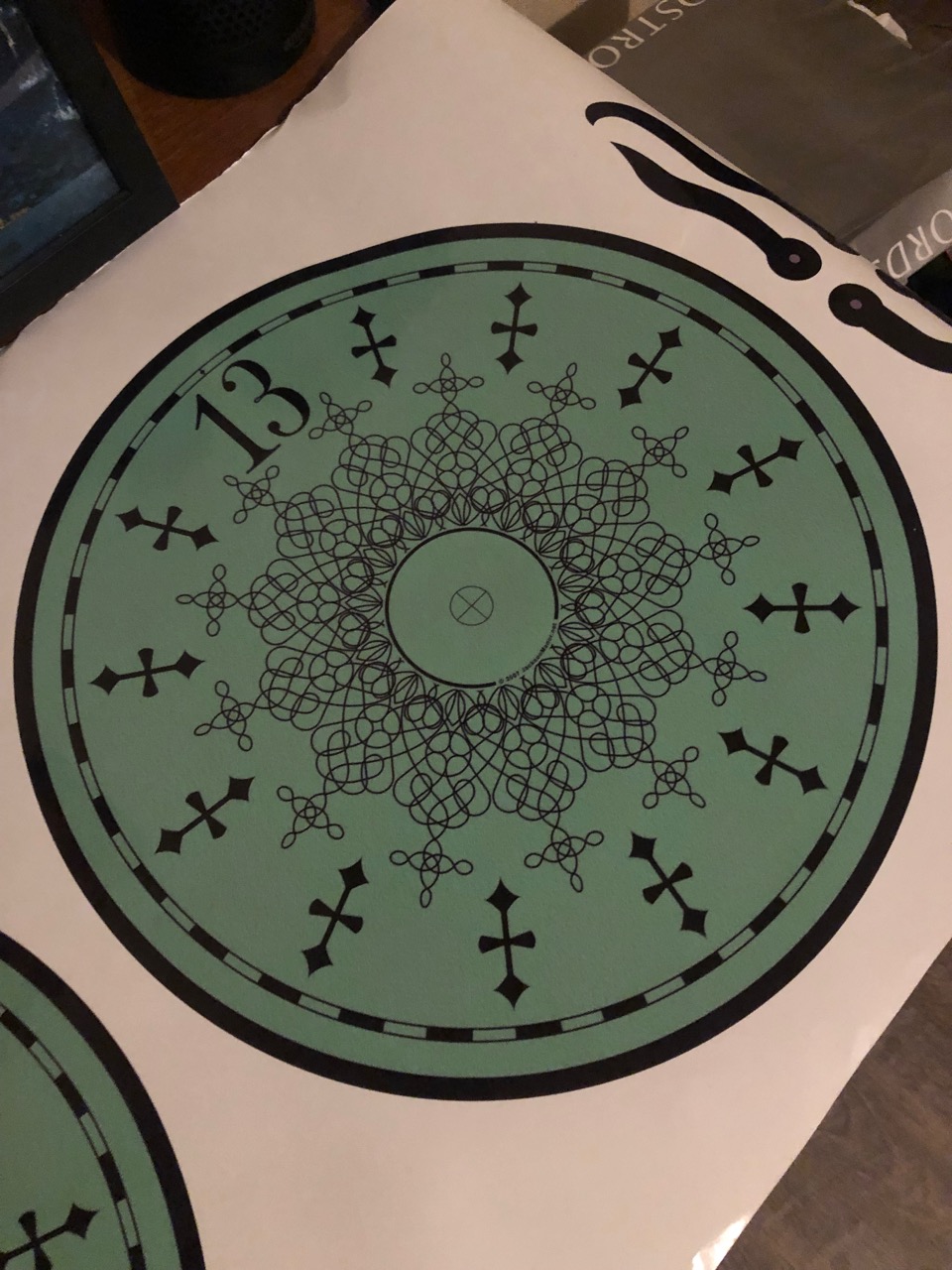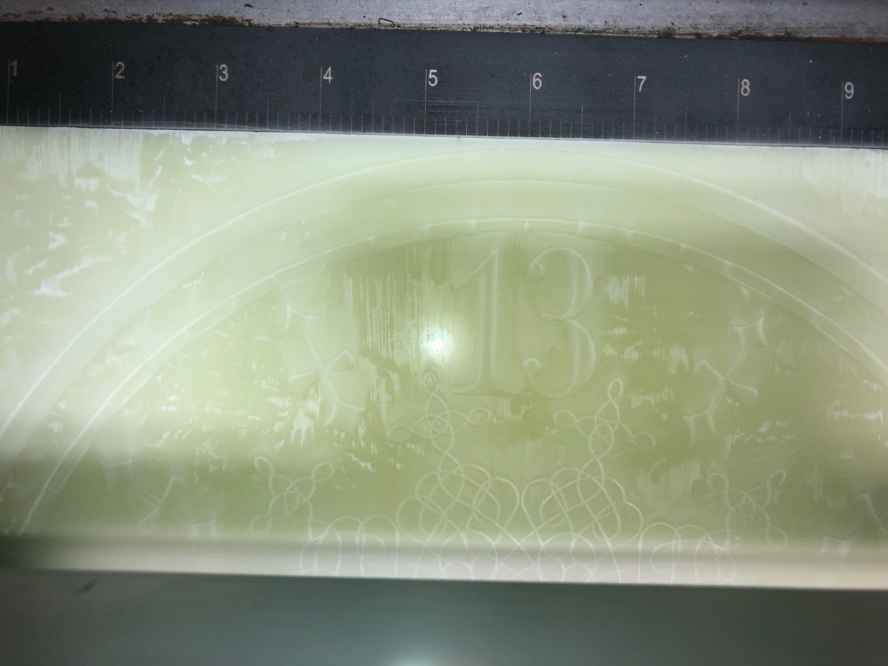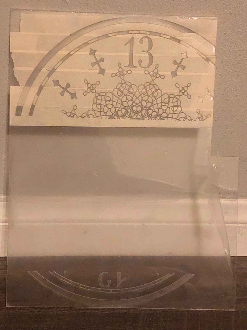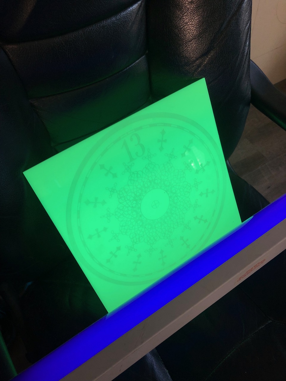 Now this part was a lot of fun for me. I went through a lot of different ideas and a few impossible wants, and it took a while to get to where I ended up. The end result was well worth it. I’m really happy with how this stage took shape. What I REALLY wanted for this thing was a glow in the dark green dial like the toy has. I wasn’t sure which materials were available to make this happen, or what I should even be asking people for. I was hoping for a glow in the dark green plastic or something of that nature… But to get the design on it… Hand paint it? print it? Stickers? I’m not even sure. Idea 1: I’d seen an image floating around which would be perfect. A high res jpeg of the clock dial laid out perfectly for printing (from our very own lostcasket, unbeknownst to me at the time!) A friend of mine printed it out BEAUTIFULLY on vinyl for me. I wasn’t sure if I was going to just adhere that to clear vinyl and backlight it? Leave enough of a gap in front of the dial to front-light it with LEDs, or take a LOT of time to hand cut out the detailing with an x-acto and just stick the details on some green plastic that I could backlight? I’m not sure. Idea 2: So I’d picked up my stickers, and while I was contemplating my possible methods of using these things I started driving door to door to every plastics/sign shop in Vegas. A couple had some green acrylic, but it wasn’t the green I wanted, usually it was clear green, one place had frosted but it was a lot greener than I’d wanted, and only sold by the sheet, WAY more than I needed and not ‘perfect’ anyway. I’d found a couple places online that had actual glow in the dark acrylic but the sticker on the webpage was way too much. Anyway, at this point I was so confused by which places I’d been to and which I hadn’t I just started calling websites that had the glow in the dark, maybe one would sell me a 12×12, even if it’s expensive it’d cost less than a sheet, and I only need one. Turns out one shop was in Santa Ana, CA, Paragon Plastics (not far from my parents’ house, link toward the bottom) and they had ACTUAL glow in the dark acrylic for 50 bucks for a 12×24” piece. Perfect! More expensive than any other color, but I’m only going to need half of this so now I’ve got two tries with the material and it’s exactly what I was looking for. I’m totally OK with this. My girlfriend just happened to be in the area that day and offered to pick it up for me, so I tell them over the phone I’ll take one 12×24” and she picks it up for me a half an hour later! Now back to the problem of… what to do with this thing? I was still considering cutting the details out of lostcasket’s sticker, it’s the best way to get perfect lines as long as I very carefully take my time. Hand painting would be possibly a better (more personal/organic) way to do it, but no way it would look as ‘perfect’, and a stencil would be tough to make… I had gone back and forth with a couple friends who tell me they have access to a laser cutter and to just clean up the image, send it to them, and come cut it. Best. Idea. Yet. I send one of them the image and he cleans it up nicely. Unfortunately what we have is a JPEG which apparently has an effect on the way the engraver works. I mention this only because we now have vector images provided by lostcasket! (linked below!) So now we’ve got the image cleaned up as much as we can and they get to work. First they printed a test image on wood, which looked amazing (I’ll be asking them to reburn me an oak dial once I decide on a stain!) Second, they ran a test on some inexpensive clear acrylic to see what adjustments we would need to make for the plastic vs the wood so we can MAYBE get this right in one shot on the much more expensive glowing plastic. The first attempt on the glow in the dark acrylic was perfect, as good as I could have hoped for. The ONLY thing we had to look at was some ghosting outlines from the laser since we didn’t tape the plastic. Being that it was frosted plastic anyway, you couldn’t even tell. We did do a second attempt without removing the protective plastic so that we could protect the acrylic with the plastic covering it. Bad idea, it cut the image into the plastic, but melted the plastic covering the plastic, into the plastic. That didn’t work too well, and now I had to hand-pick dozens of tiny pieces of well stuck flat protective plastic from the design on the acrylic. I think it will be just as useable as the first one, but the first one is more perfect, so that’s the one we’re going to use. (lostcasket has since provided me with a link of 3 vector images to download (and distribute!) so we will eventually be re-doing this for one more dial with all of our lessons learned.) When we do another, we’ll be removing the protective plastic, covering it with painters tape, lasering it using the newly acquired vector images, spray painting it, peeling the tape and enjoying a very easy perfect print. But we’ll get into paint in the next post.