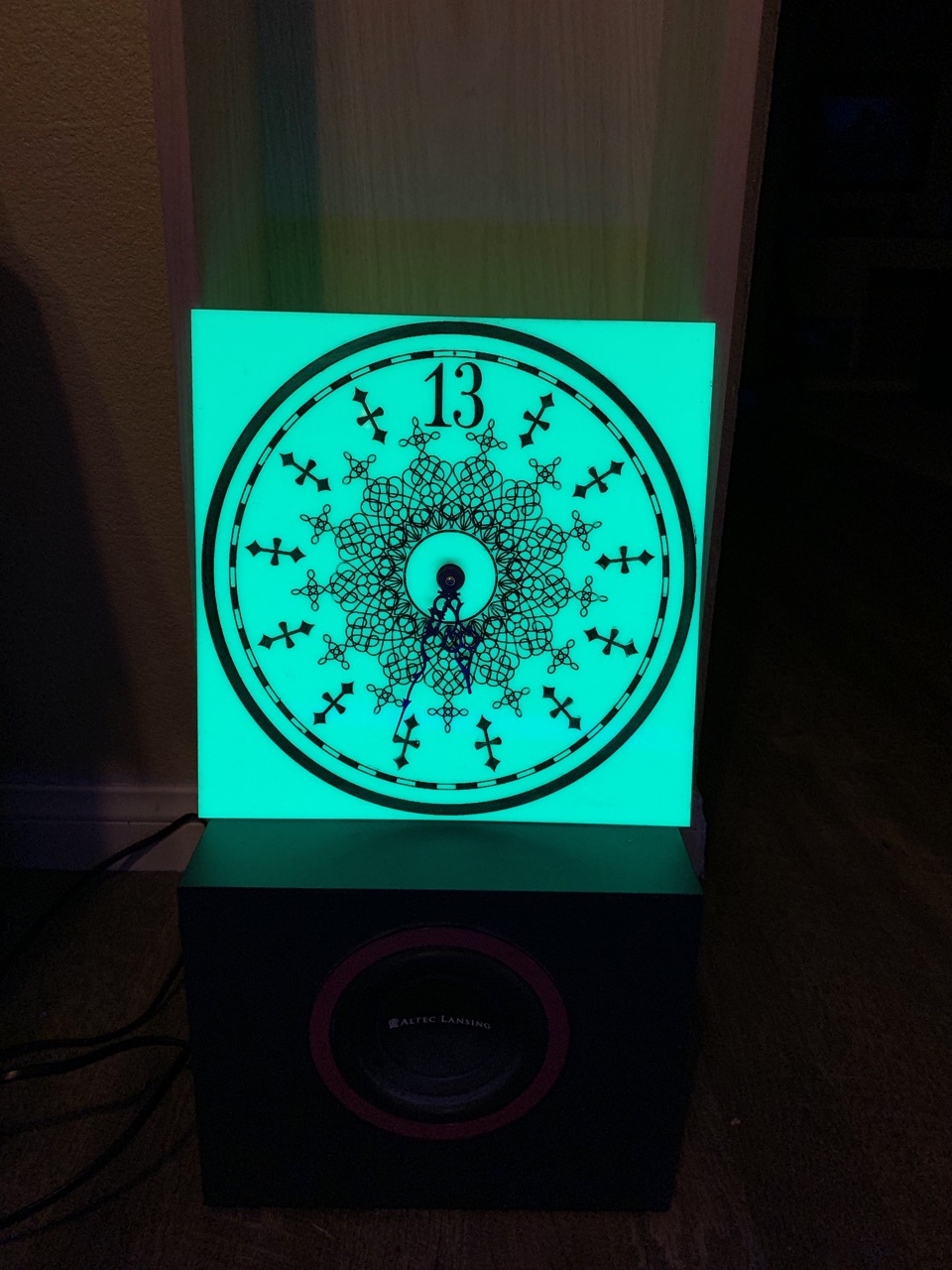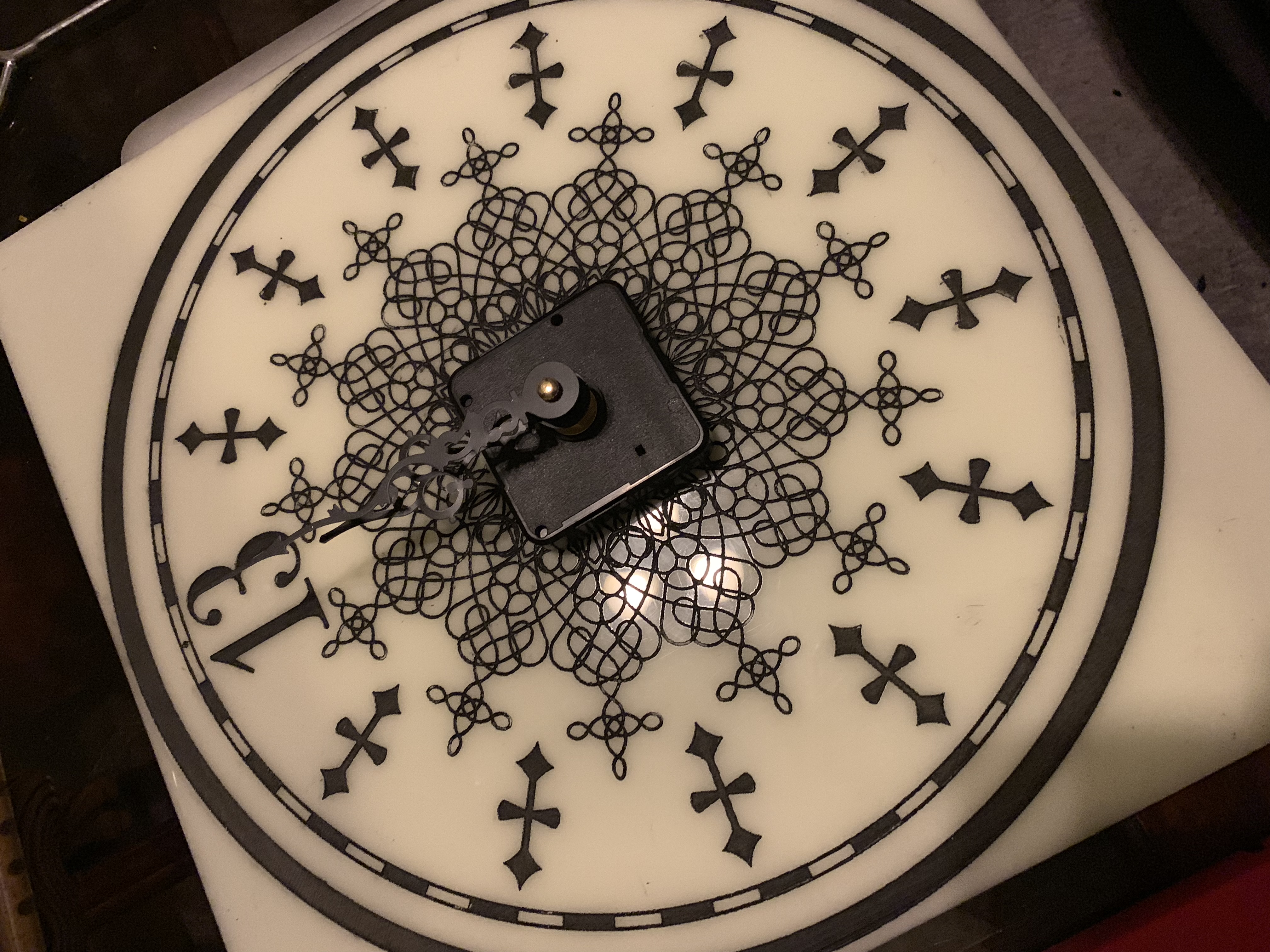 The original idea which was sadly thrown out was to put a real grandfather clock movement in it. There’s just something so satisfying about a real solid grandfather clock movement, they’re just so nice with that tick, the chimes, the sound of the chains when you wind them… but that price tag. What I’d really LOVE to do some day is find a way to control the hands with a Raspberry Pi (since that’s what will be driving other parts of this clock anyway). Set it up to stay synced with NTP so it’ll always be accurate. Surprisingly to me, there are very few Pi controlled analog clock projects out there, tons of digital, but it looks like analog may be a lot tougher. So for now, that moves to the after-build list of future upgrades. Quartz will do for the time being! | |