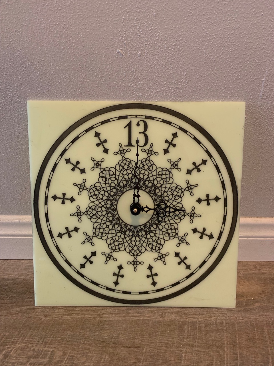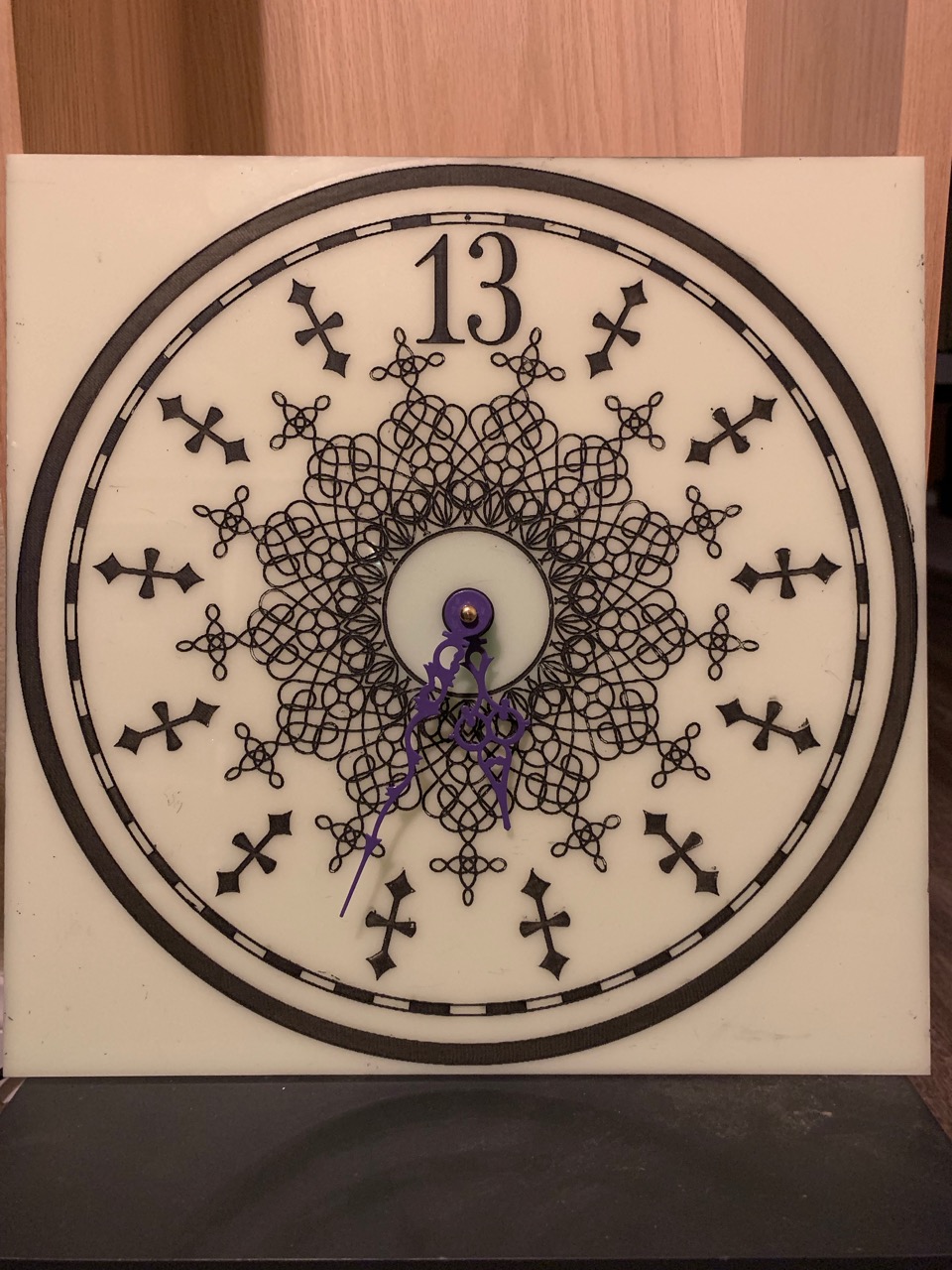 Unfortunately the design of the hands gets a little bit lost in the inner design of the clock, especially black hands over the black design. So I decided to paint them. I went with a nice solid purple to match the color themes of the mansion and hit it with a nice triple gloss spray to make it really pop. I love the color and the shine, but… I’m wondering if a nice bright red or crimson might work a little bit better…? More of a blood red color with the same shine coat may stand apart from the designs in the dial a little bit better… I think the hands were only a couple bucks so I might just grab another set and paint those separately so I can compare and keep whichever works best.